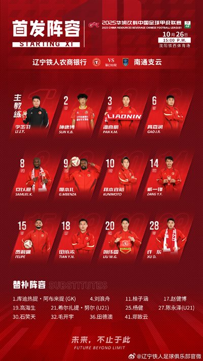6686体育平台10月26日讯 中甲联赛事第28轮,辽宁铁人主队场迎战南通支云,赛前双方首发出炉。
