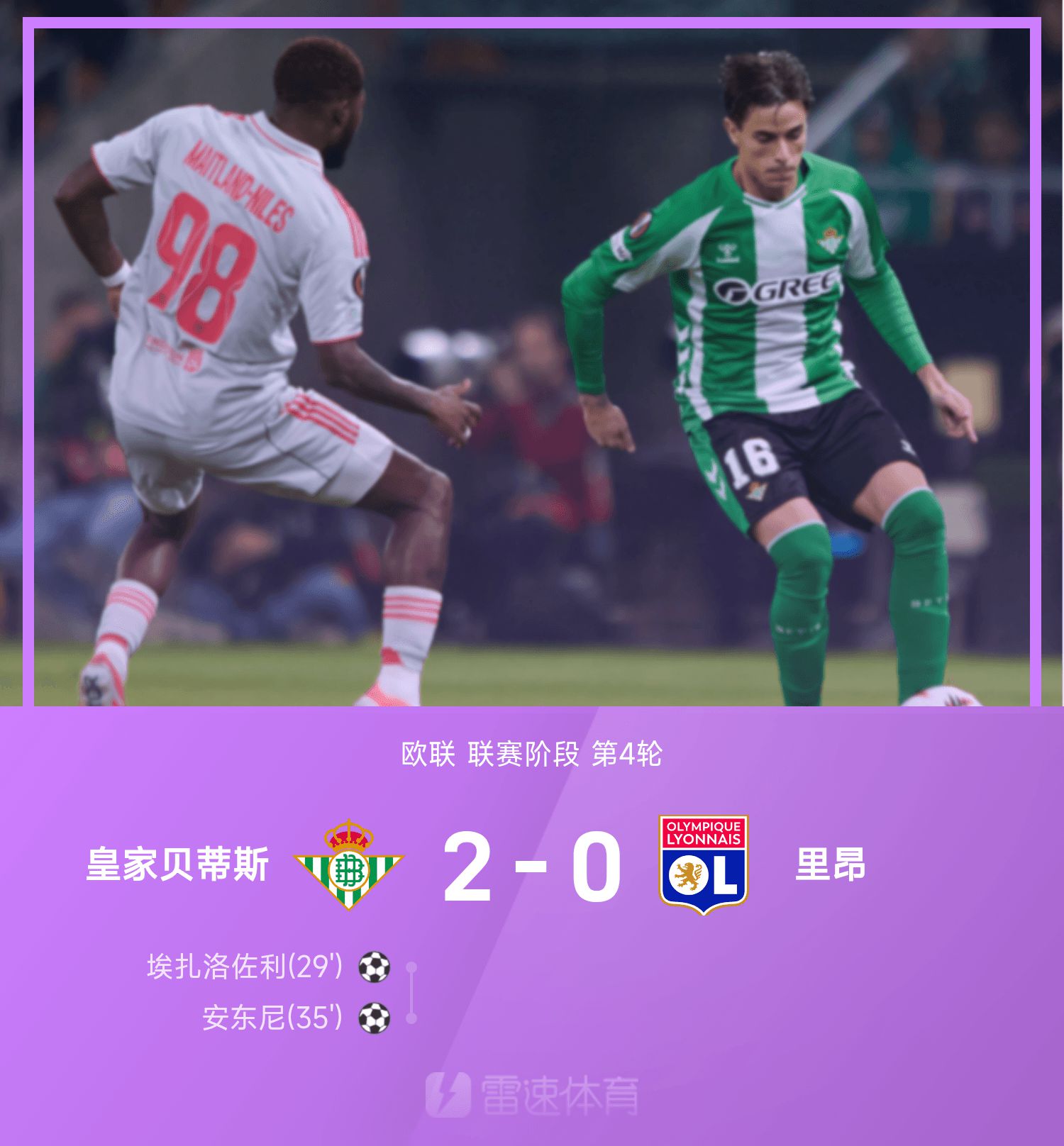 欧联战报:安东尼连场破门,皇家贝蒂斯2-0里昂