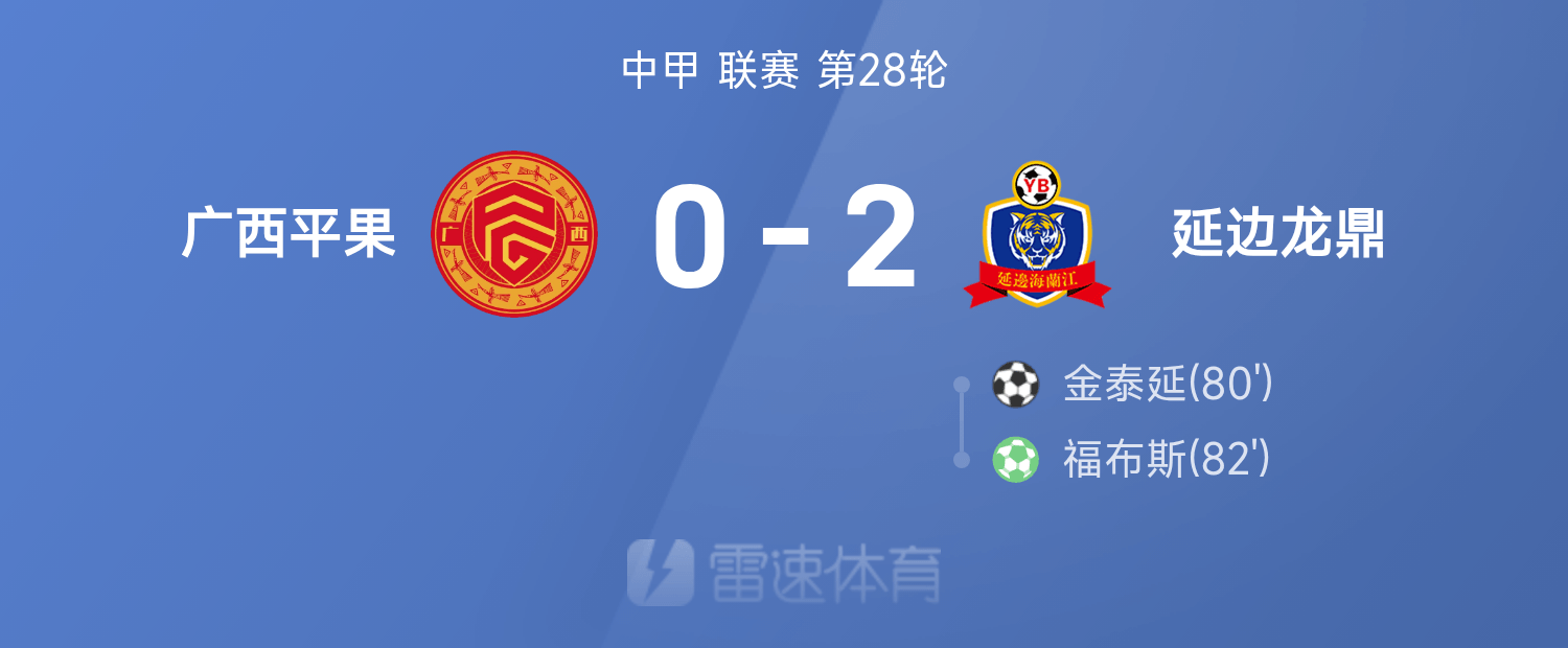 6686体育平台10月26日讯 25赛季中甲联赛事第28轮,延边龙鼎2-0战胜广西平果。全场竞赛,福布斯、金泰延破门建功。