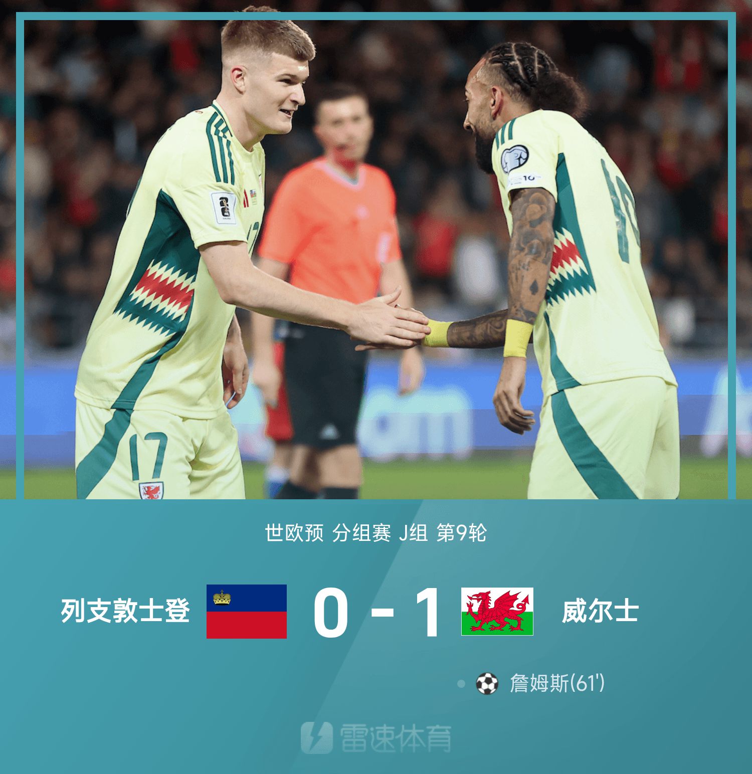 6686体育平台11月16日讯 26赛季世欧预分组赛J组第9轮,列支敦士登坐镇主队场迎战威尔士。上半场,布罗德黑德破门,裁判员介入视频裁判判定进球无效。下半场,第61分钟,詹姆斯破门打进全场唯一进球锁定战局。最终,威尔士1-0险胜列支敦士登,威尔士分组赛有望晋级世杯赛名额。
