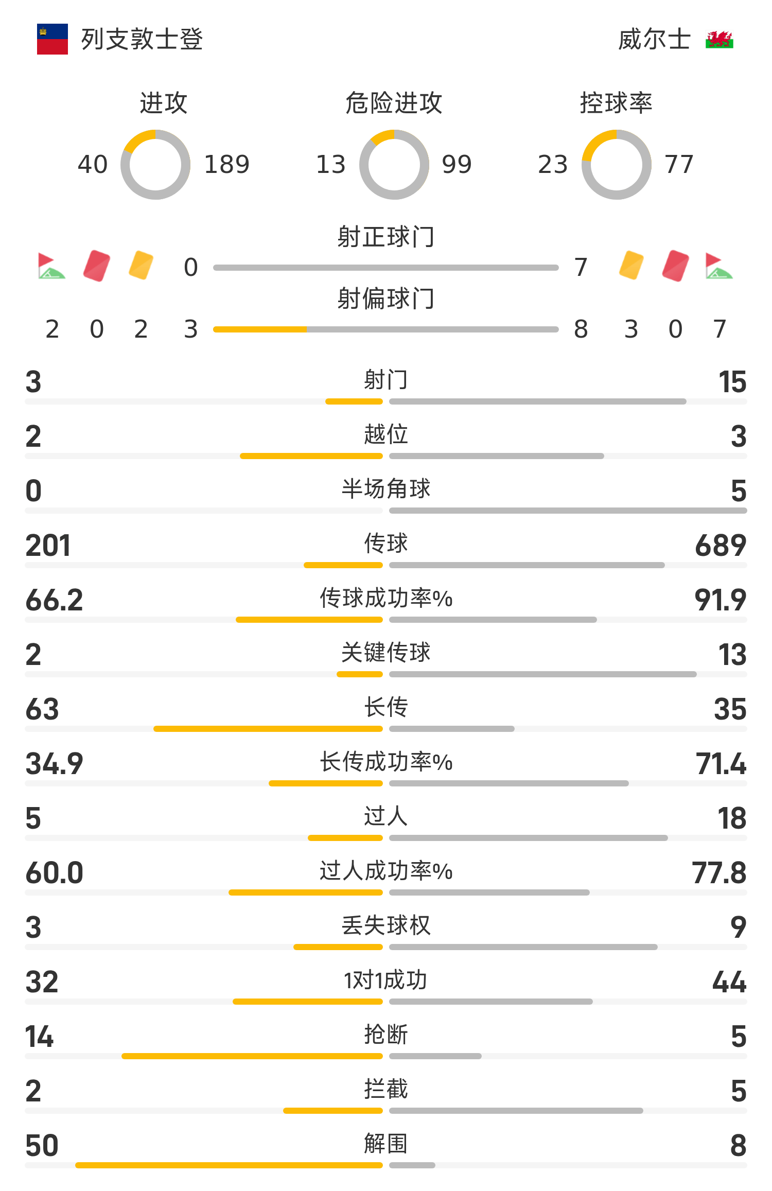 威尔士首发阵容:1-达洛、15-达席尔瓦、6-罗登、3-威廉姆斯、4-劳勒、20-詹姆斯(66’7-布鲁克斯)、5-阿姆帕杜、19-托马斯(83’11-约翰逊)、17-詹姆斯(77’10-库伦)、18-哈里斯(66’9-库马斯)、23-布罗德黑德(65’8-科维尔)