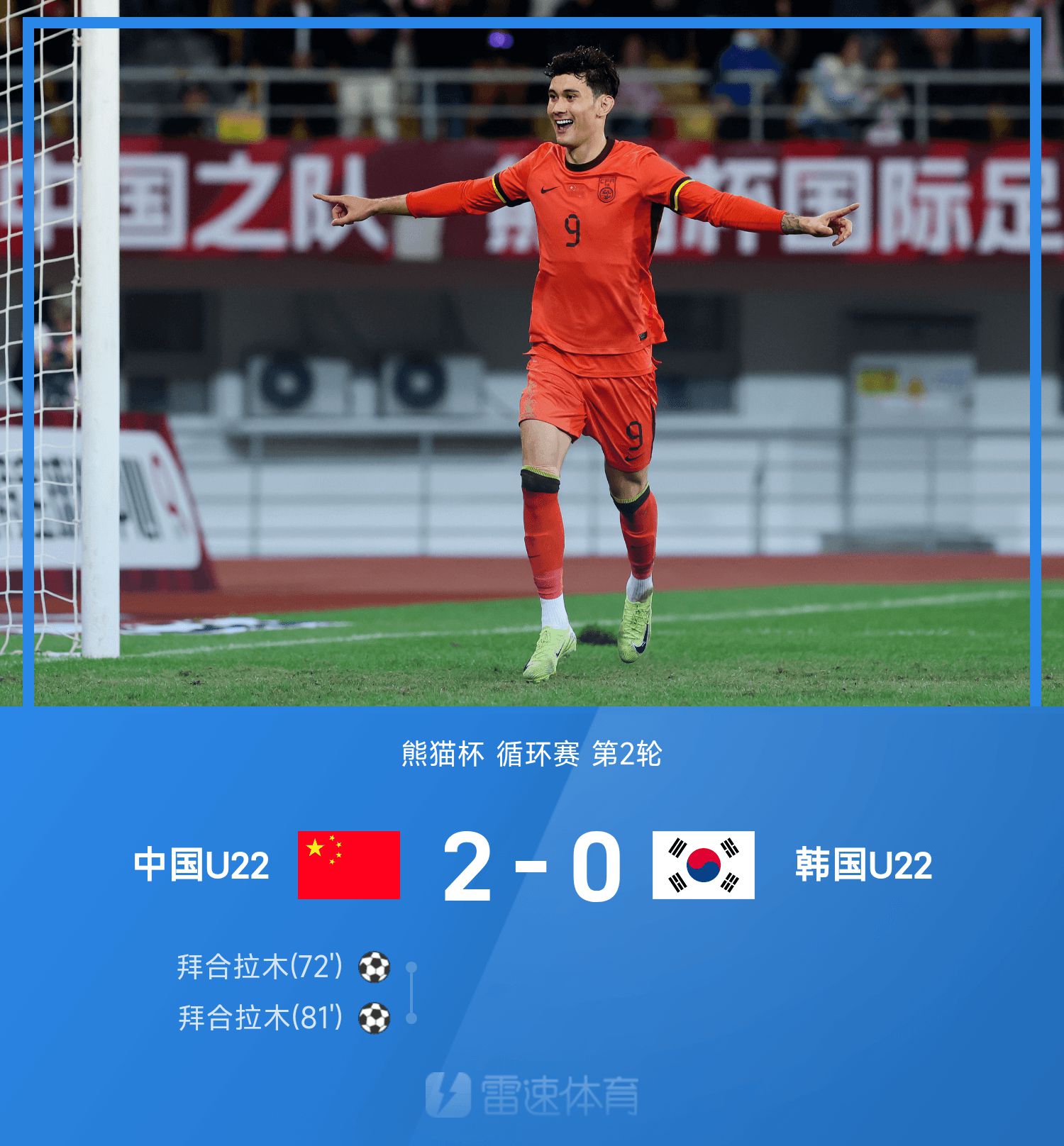 6686体育平台11月15日讯 25赛季熊猫杯循环赛第2轮,中国U22对阵韩国U22。上半场,徐彬倒脚差错险些送礼,金容鹤错失良机;下半场,李镇全进球被吹越位在先,拜合拉木先是低射打破僵局,随后又脚后跟破门完成梅开二度。最终,中国U22 2-0完胜韩国U22。