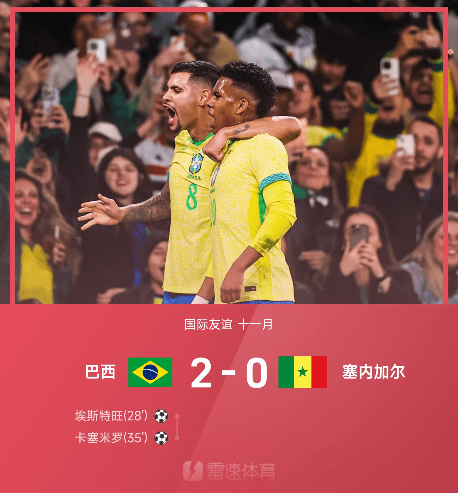 6686体育平台11月16日讯 25赛季国际友谊十一月,巴西2-0战胜塞内加尔。上半场竞赛,埃斯特旺右路大力轰门得手,卡塞米罗运用对手差错机会抢点破门,下半场双方均无建树,加布里埃尔受伤离场。