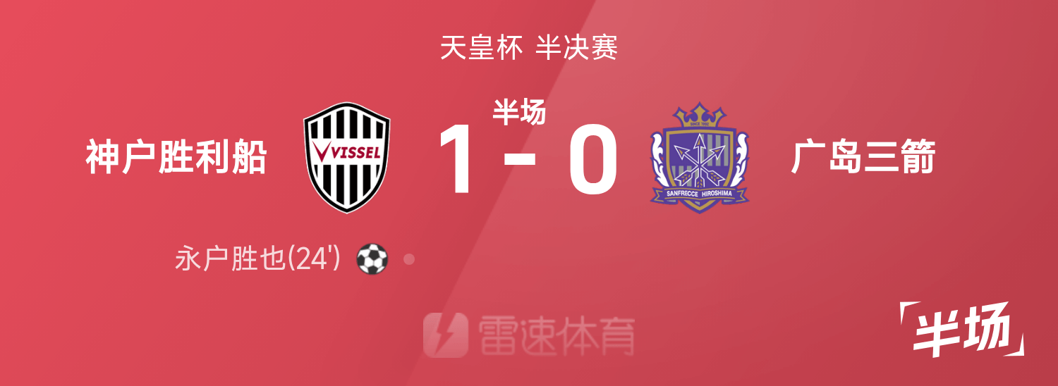 天皇杯半场:永户胜也破门,神户胜出局船1-0广岛三箭