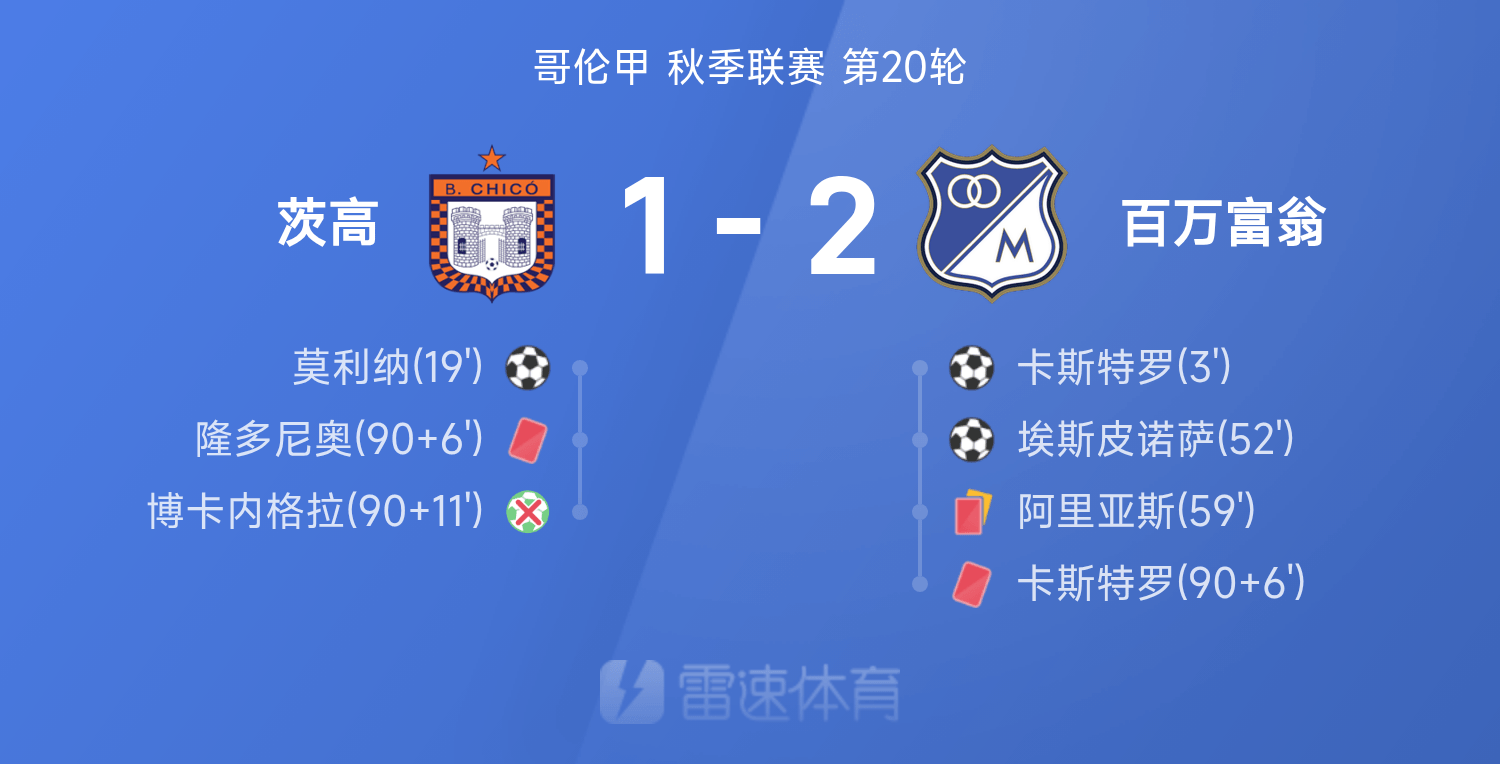 6686体育平台11月13日讯 25赛季哥伦甲秋季联赛事第20轮,百万富翁2-1战胜茨高。全场竞赛,埃斯皮诺萨发挥出色贡献1射1传,卡斯特罗破门建功,莫利纳破门难救主,博卡内格拉在最后时刻读秒失点,卡斯特罗、隆多尼奥染红。