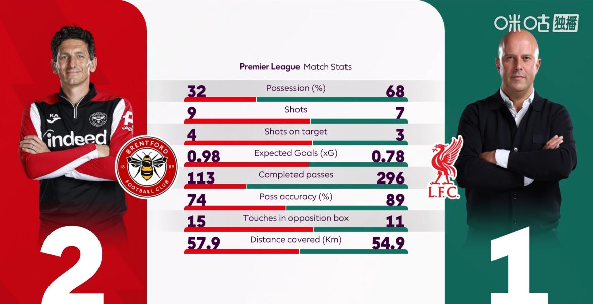 利物浦vs布伦特福德半场数据:盘球率73开,主队打门数占优