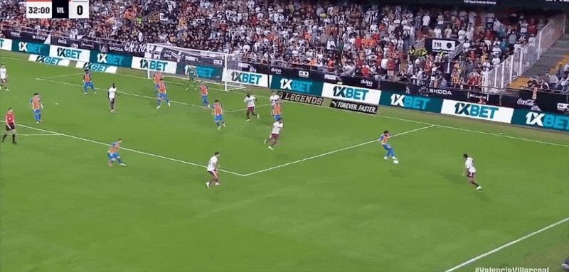33’丹朱玛后场玩火险酿祸,维加选择一脚打门被瓦伦守门员没收
