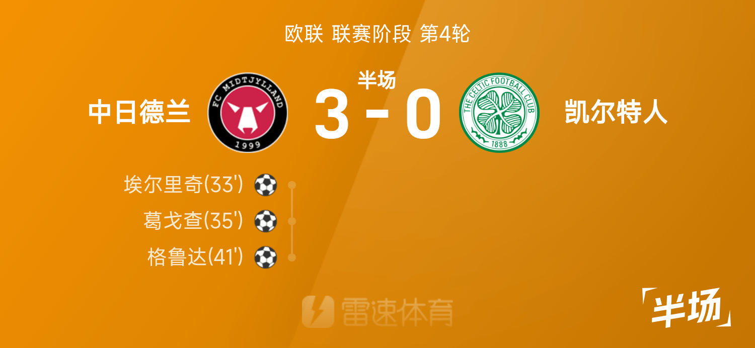 6686体育平台11月07日讯 25/26赛季欧联联赛事阶段第4轮,中日德兰迎战凯尔特人。半场战罢,双方赛果分暂为中日德兰3-0凯尔特人,葛戈查发挥出色贡献1射1传。