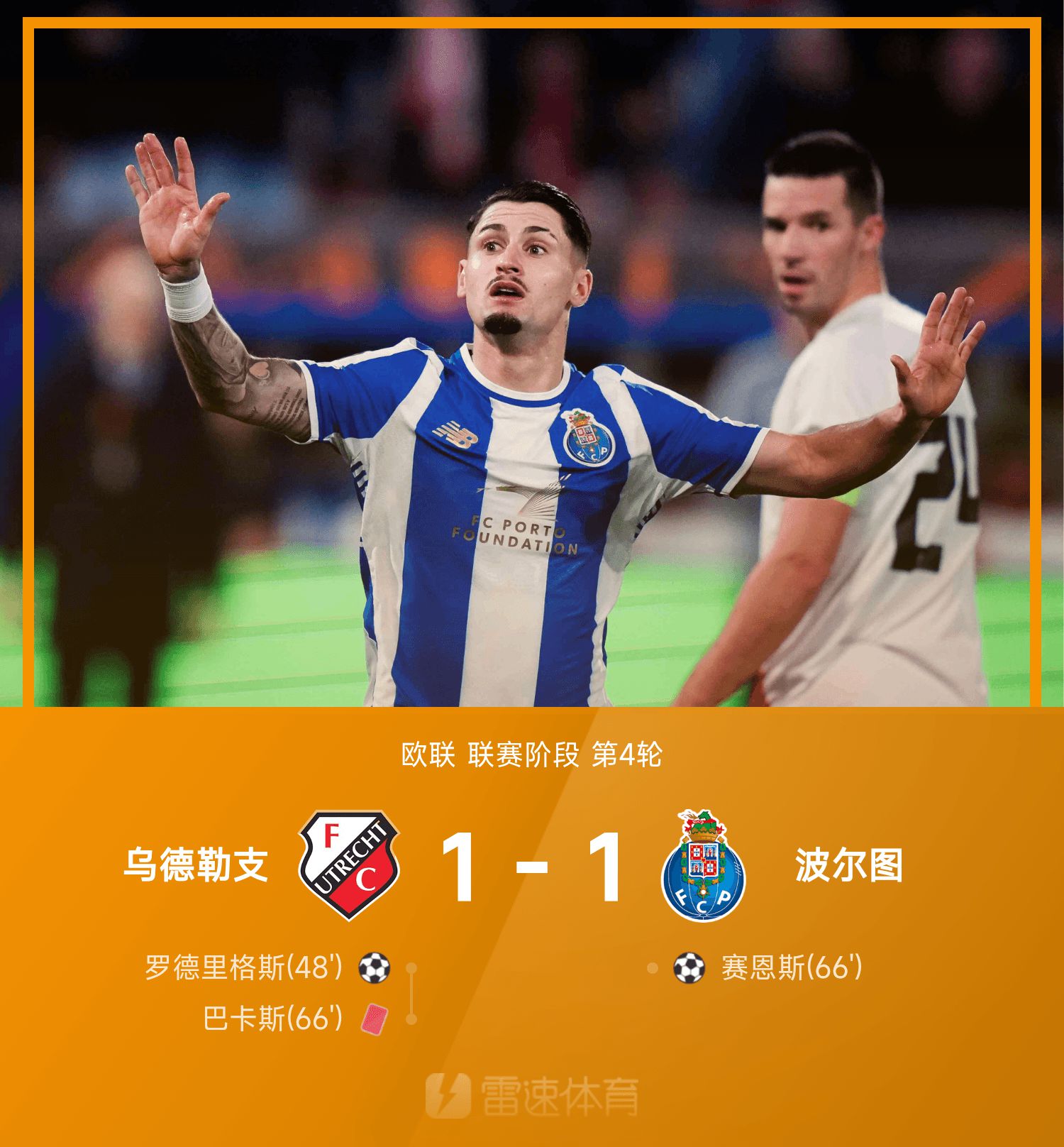 6686体育平台11月07日讯 25/26赛季欧联联赛事阶段第4轮,乌德勒支对战波尔图。上半场,双方均无建树。下半场,第48分钟,罗德里格斯建功打破僵局。赛恩斯空门兜射扳平赛果分。期间,乌德勒支守门员巴卡斯与波尔图球员发生争执被罚下牌罚下,乌德勒支以十人应战。最终,十人乌德勒支1-1战平波尔图,双方握手言和,竞赛终结。
