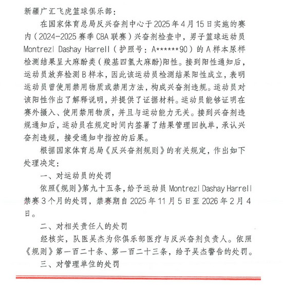 篮协:哈雷尔激动剂违规禁赛3个月,新疆承担3.6万检测费