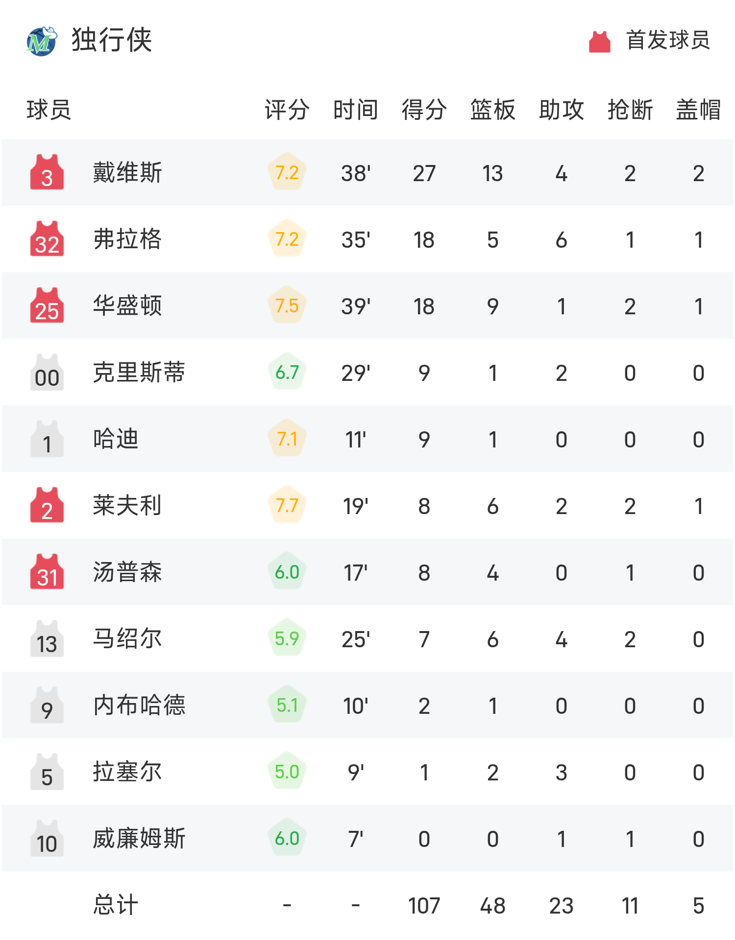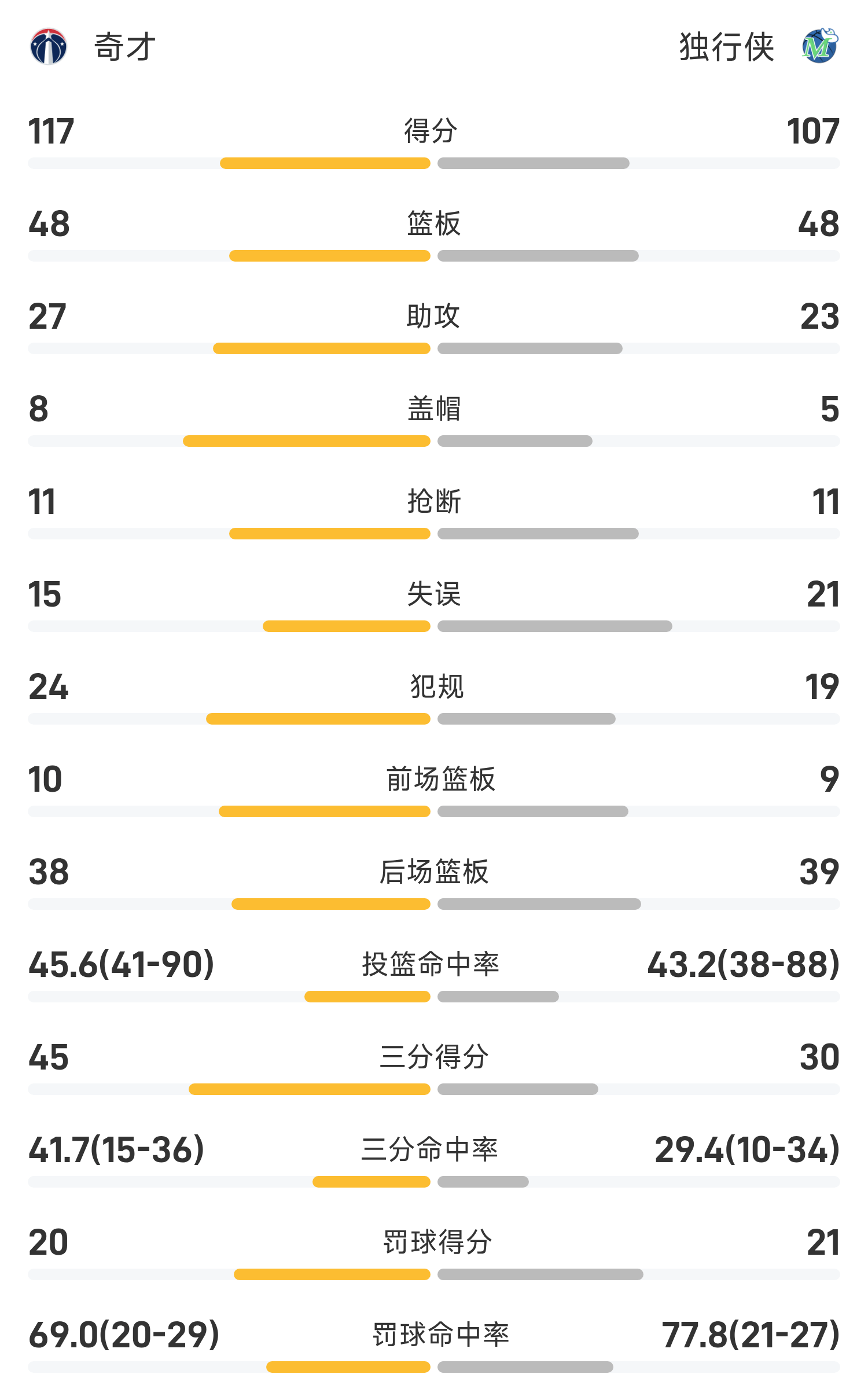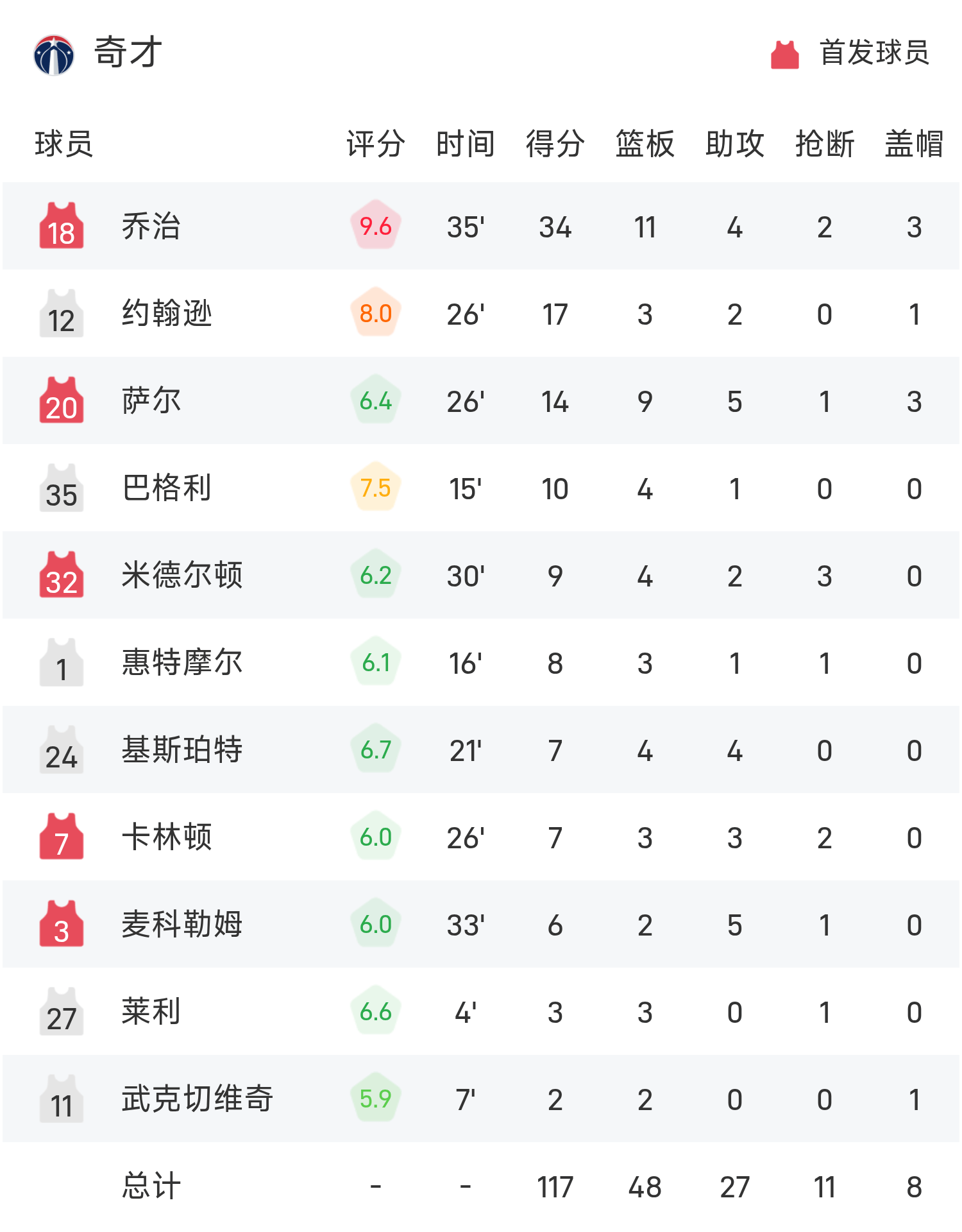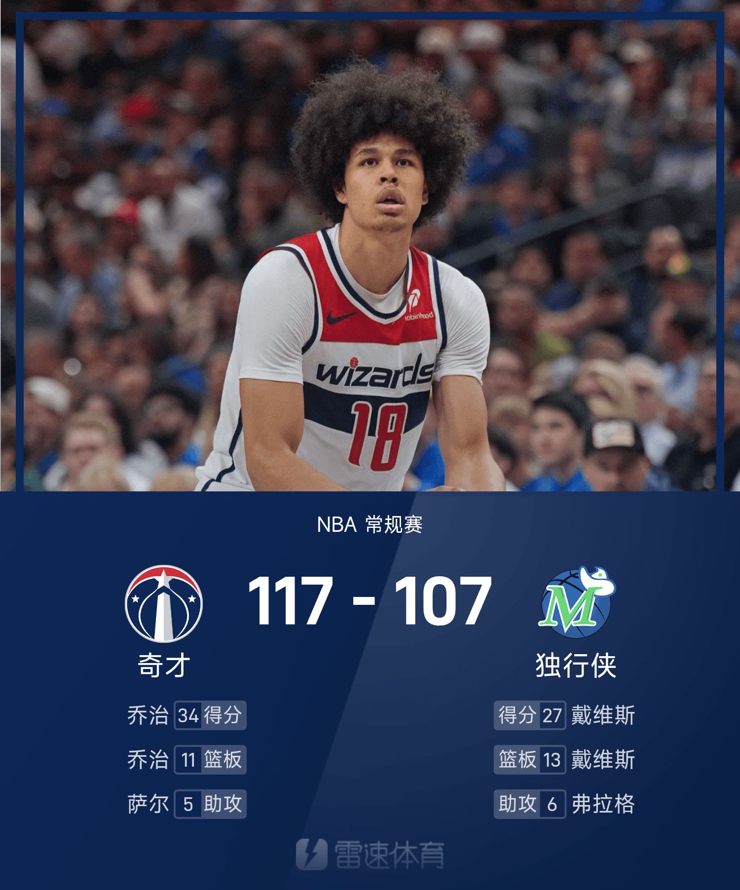 6686体育平台10月25日讯 25/26赛季NBA 常规赛,独行侠对阵奇才。双方全场战罢,独行侠107-117不敌奇才。乔治砍下全场最高的34分11板4助,率领奇才胜利取胜。