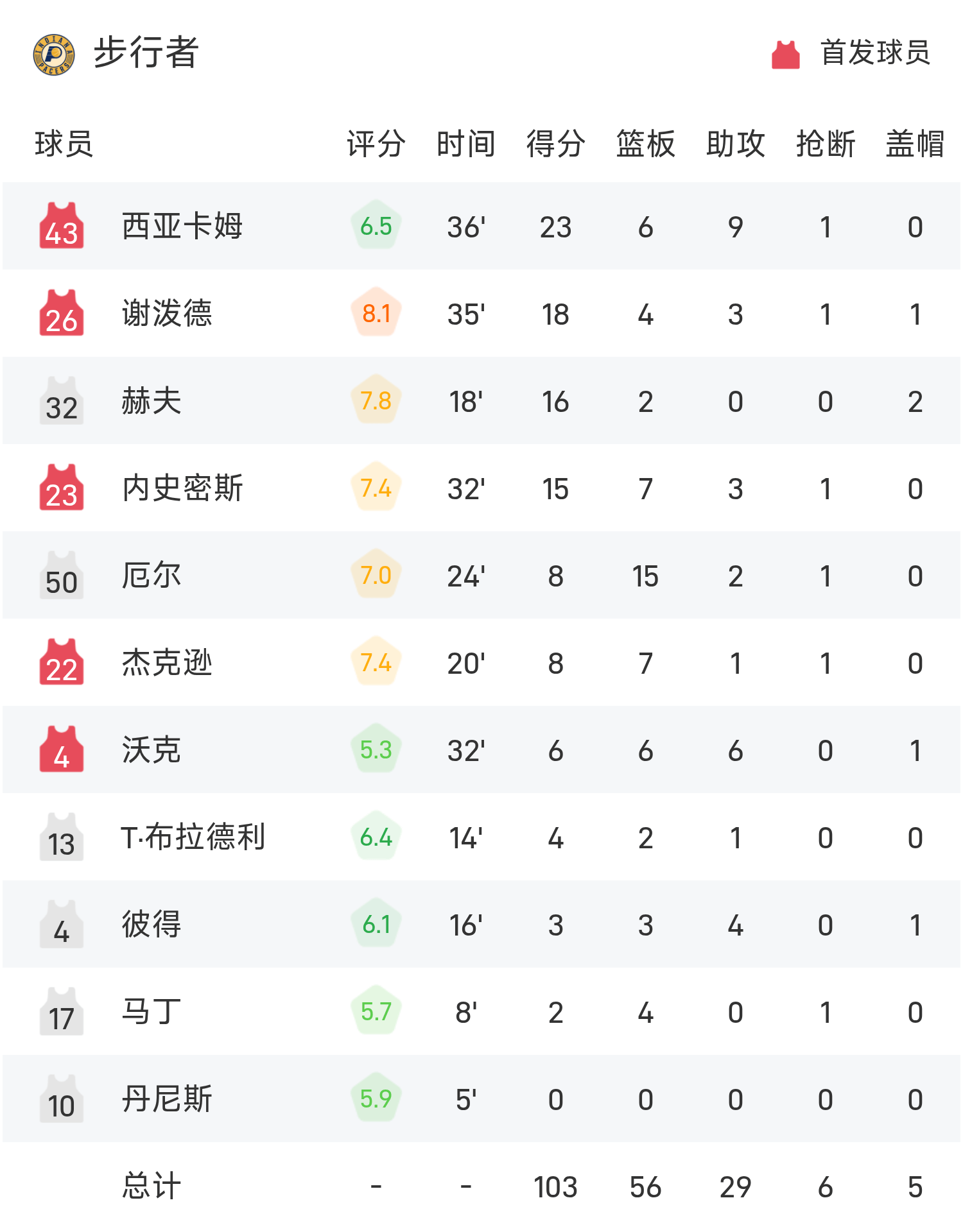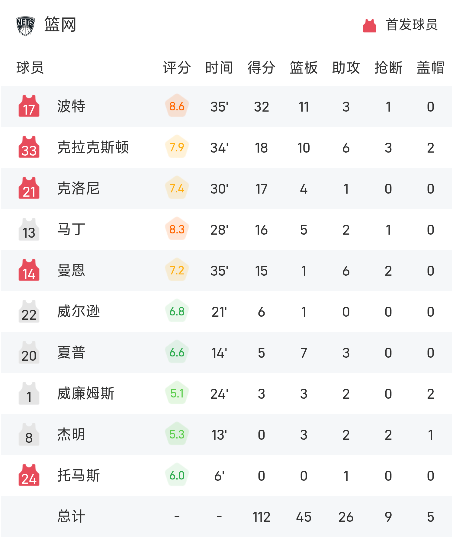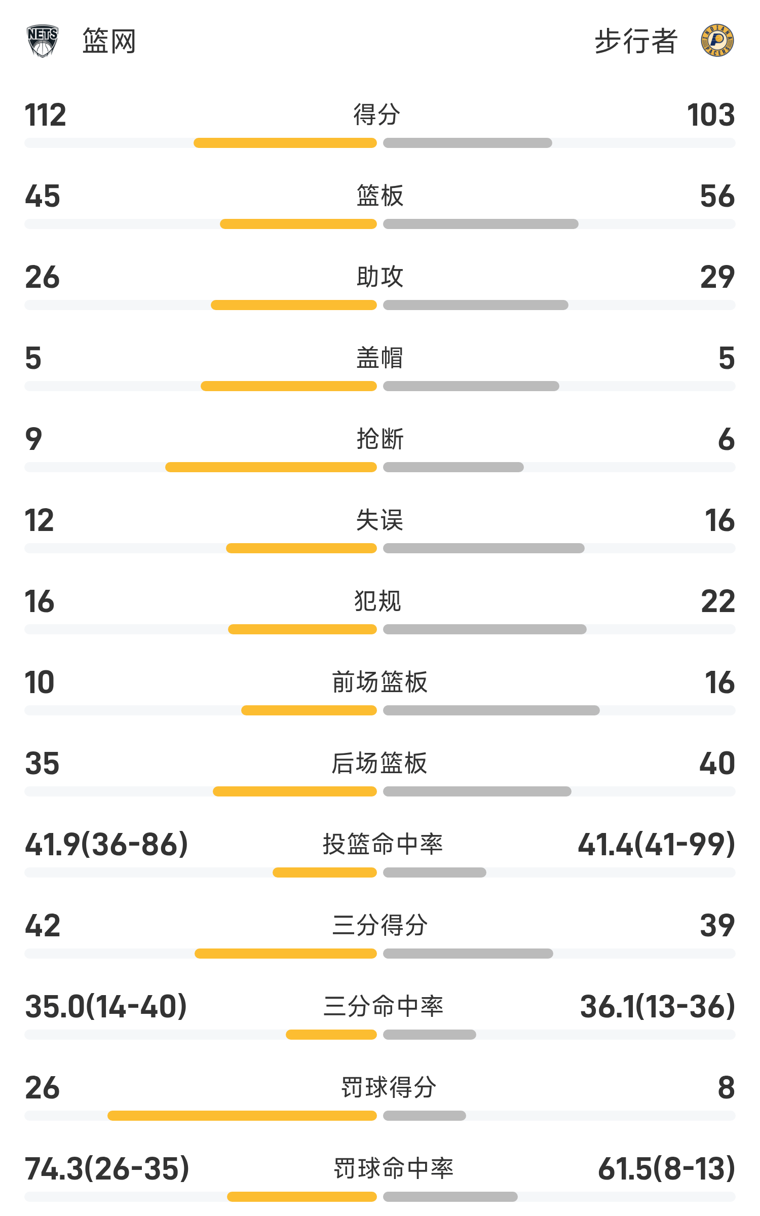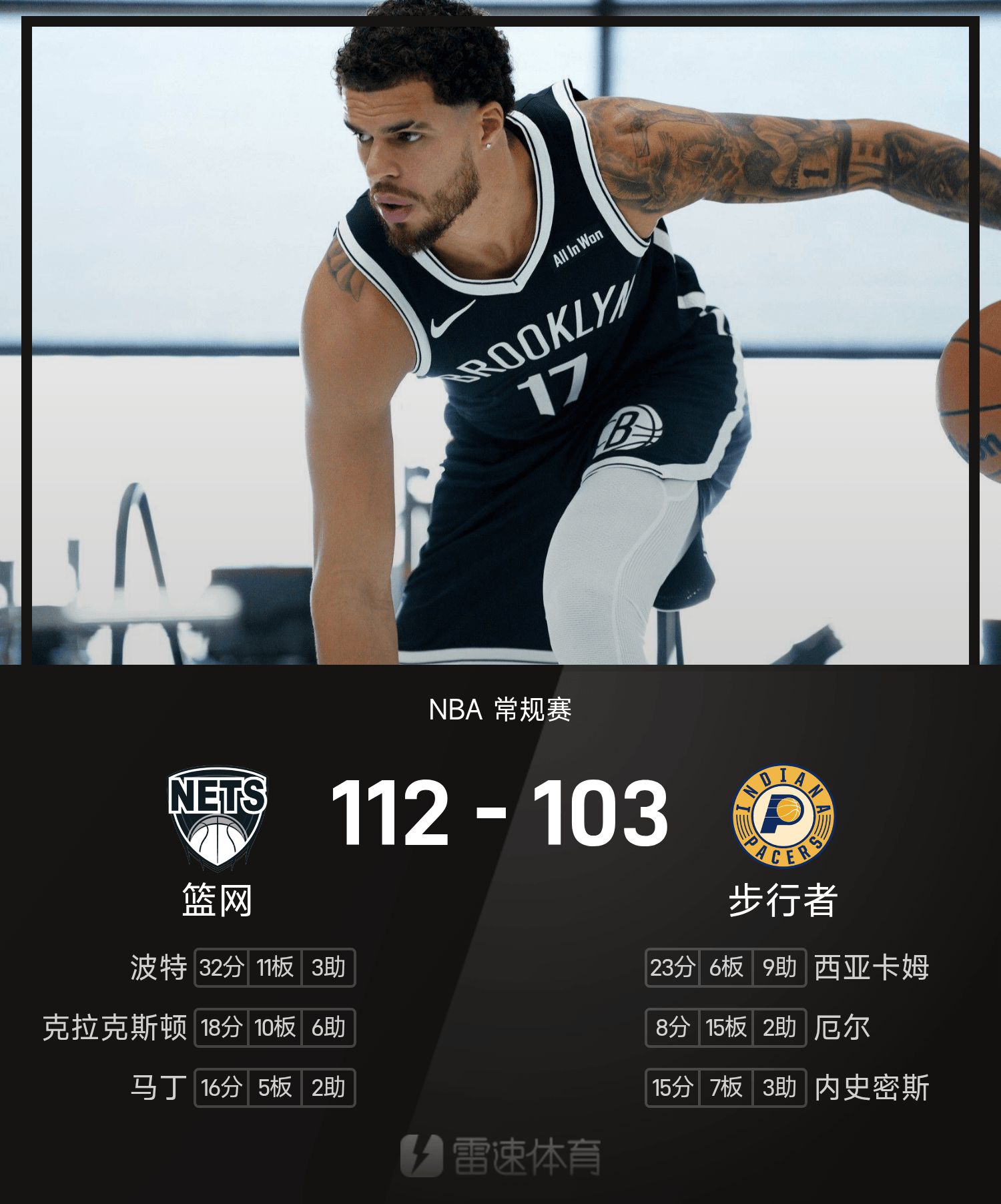 6686体育平台11月06日讯 25/26赛季NBA 常规赛,步行者对阵篮网。双方全场战罢,步行者103-112不敌篮网。波特砍下全场最高的32分10板2助,率领篮网胜利取胜。