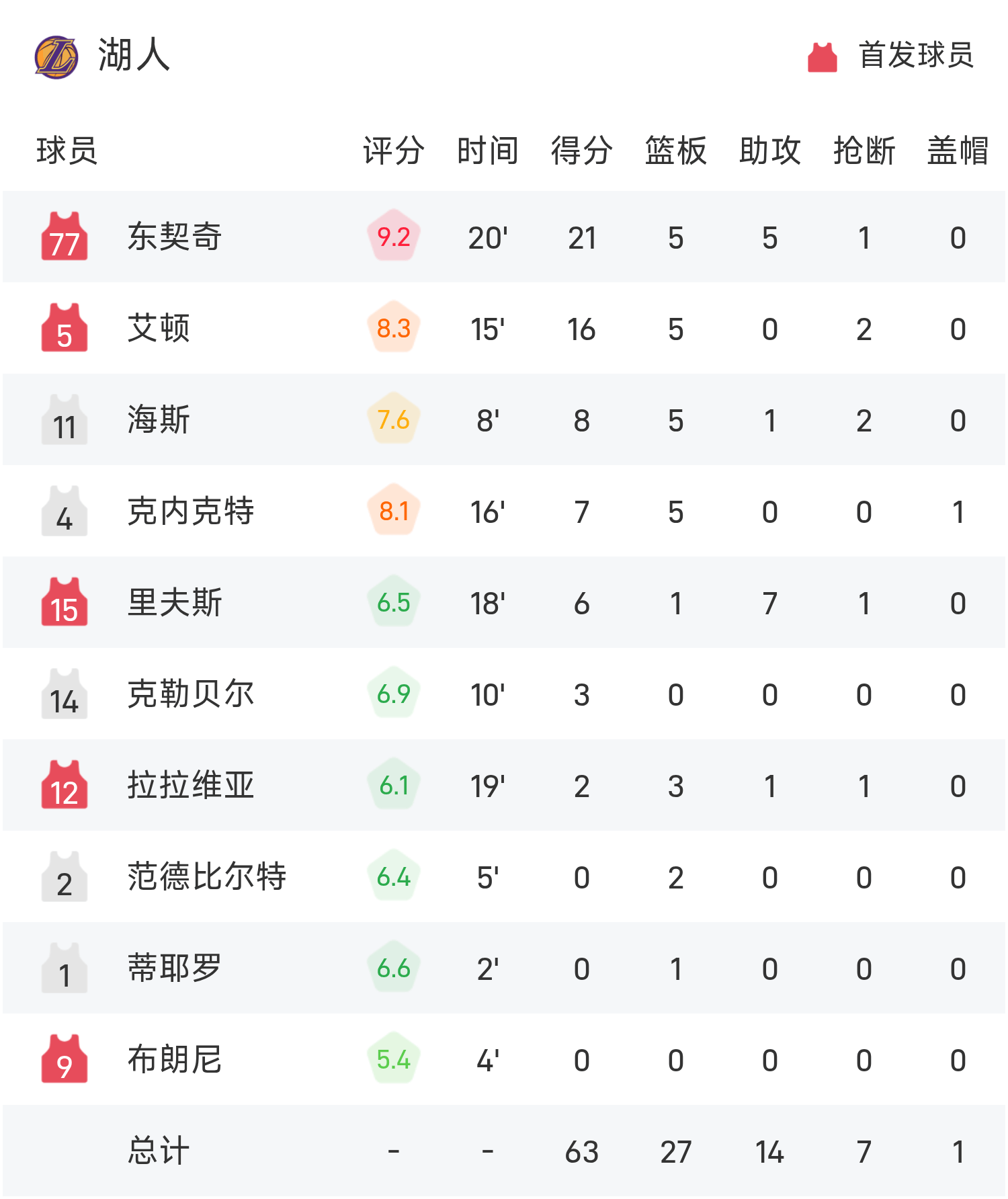 东契奇砍下全场最高的21分5板5助,字母哥14分5差错,库兹马6投0中仅得1分。