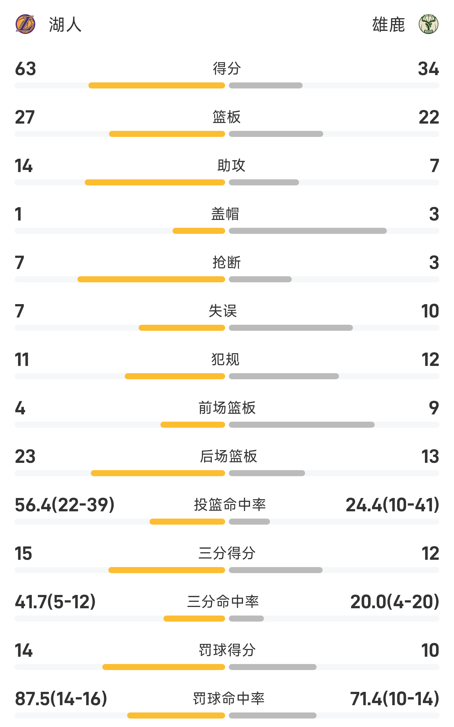 双方目前半场战罢,雄鹿34-63跟跑位湖人29分。
