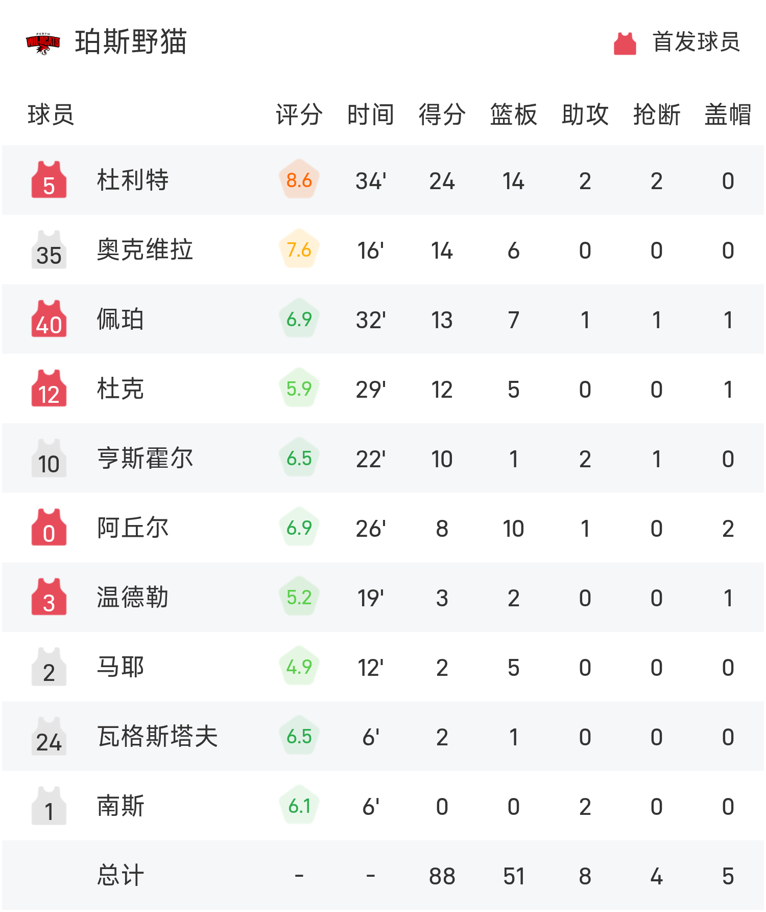 6686体育平台11月15日讯 25/26赛季NBL 常规赛,珀斯野猫对阵新西兰毁坏者。双方全场战罢,珀斯野猫88-75战胜新西兰毁坏者。杜利特砍下全场最高的24分14板2助,率领珀斯野猫胜利取胜。
