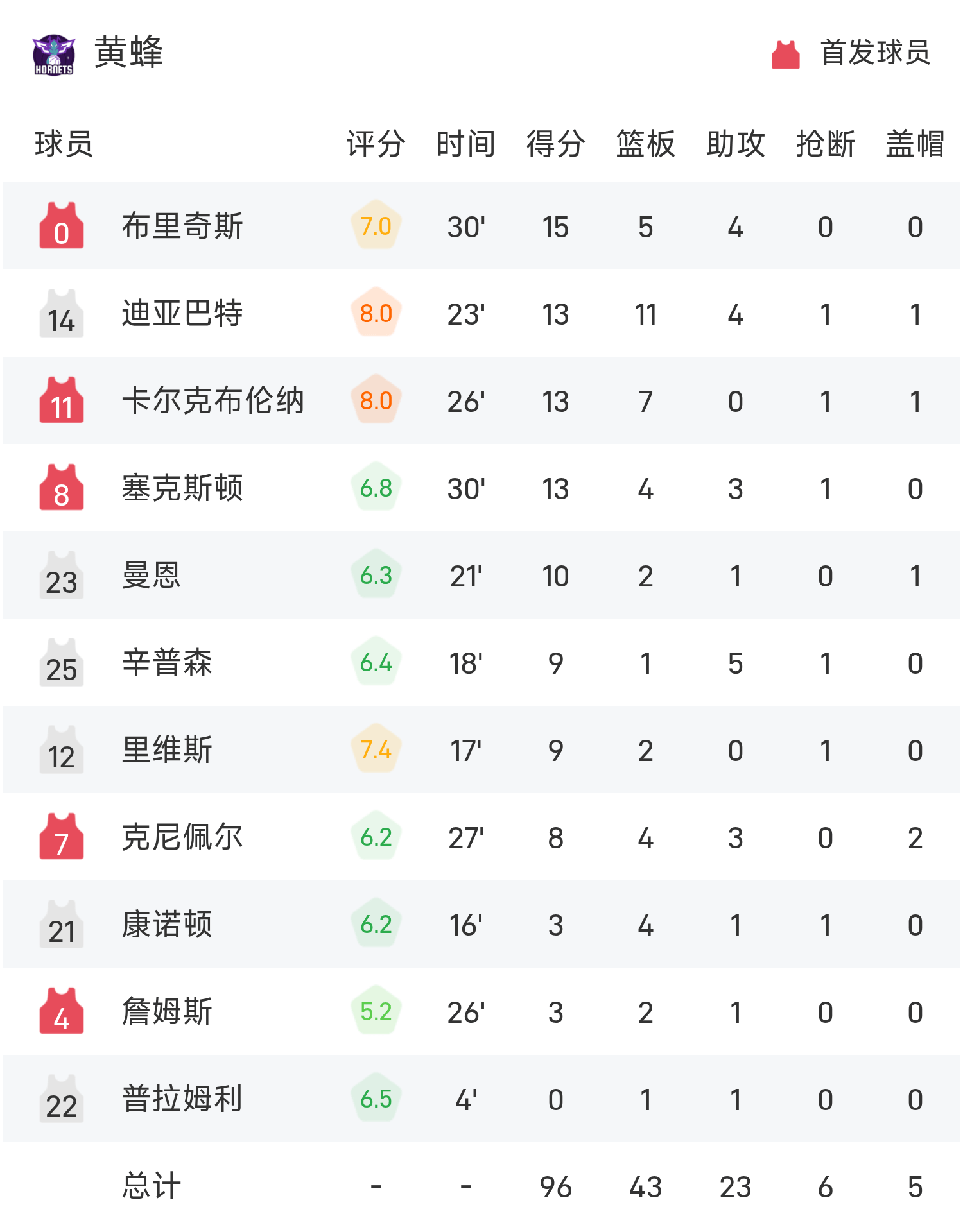 双方全场战罢,黄蜂96-109不敌雷霆。