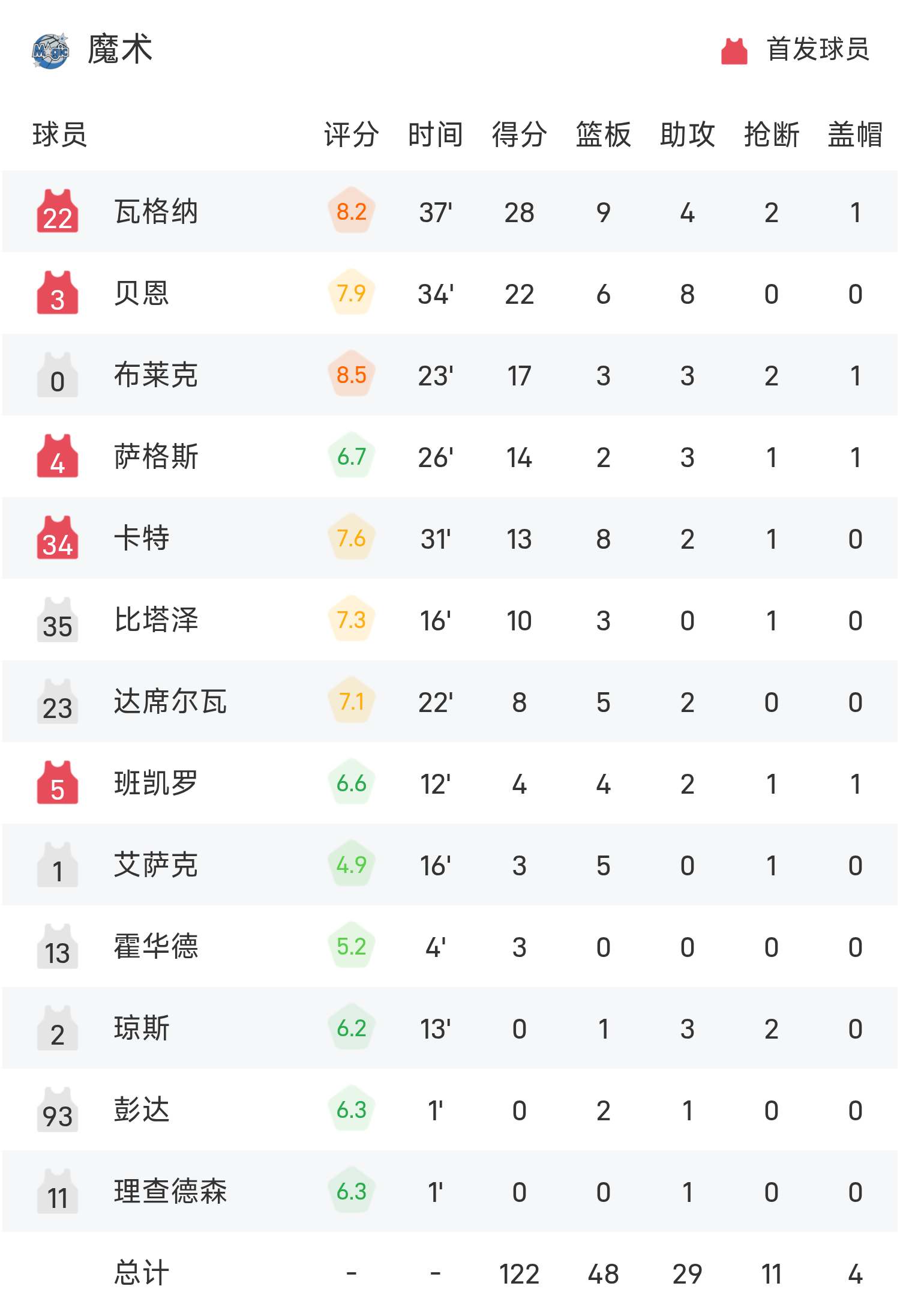 瓦格纳得到28分9板4助率队取胜,布伦森空砍全场最高的31分3板6助。