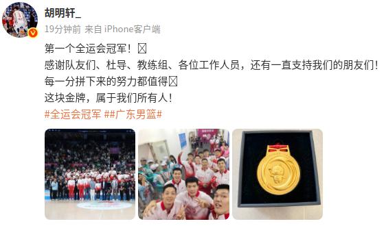 6686体育平台11月13日讯 全运男篮总决赛,广东队击败浙江队,获得冠军,赛后,胡明轩在社媒发文分享自己的感想。