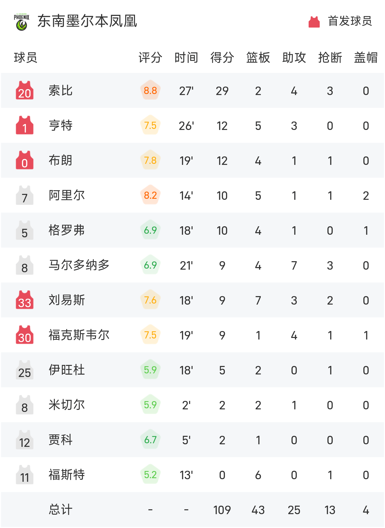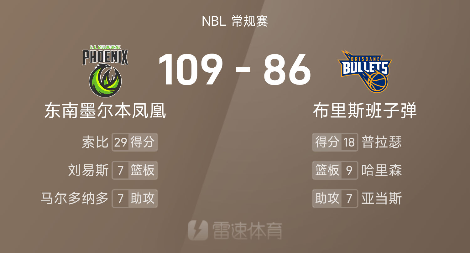 NBL战报:索比29分,东南墨尔本凤凰109-86大胜布里斯班子弹
