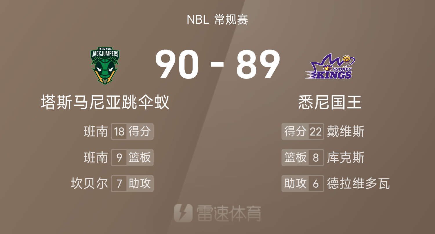 6686体育平台10月26日讯 25/26赛季NBL 常规赛,悉尼国王对阵塔斯马尼亚跳伞蚁。双方全场战罢,悉尼国王89-90不敌塔斯马尼亚跳伞蚁。班南得到18分9板2助率队取胜,戴维斯空砍全场最高的22分6板5助。