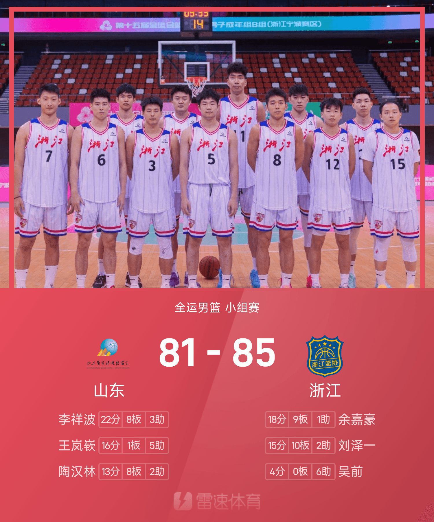 6686体育平台11月06日讯 全运男篮分组赛,浙江对阵山东。双方全场战罢,浙江85-81战胜山东。余嘉豪得到18分9板1助率队取胜,李祥波空砍全场最高的22分8板3助。